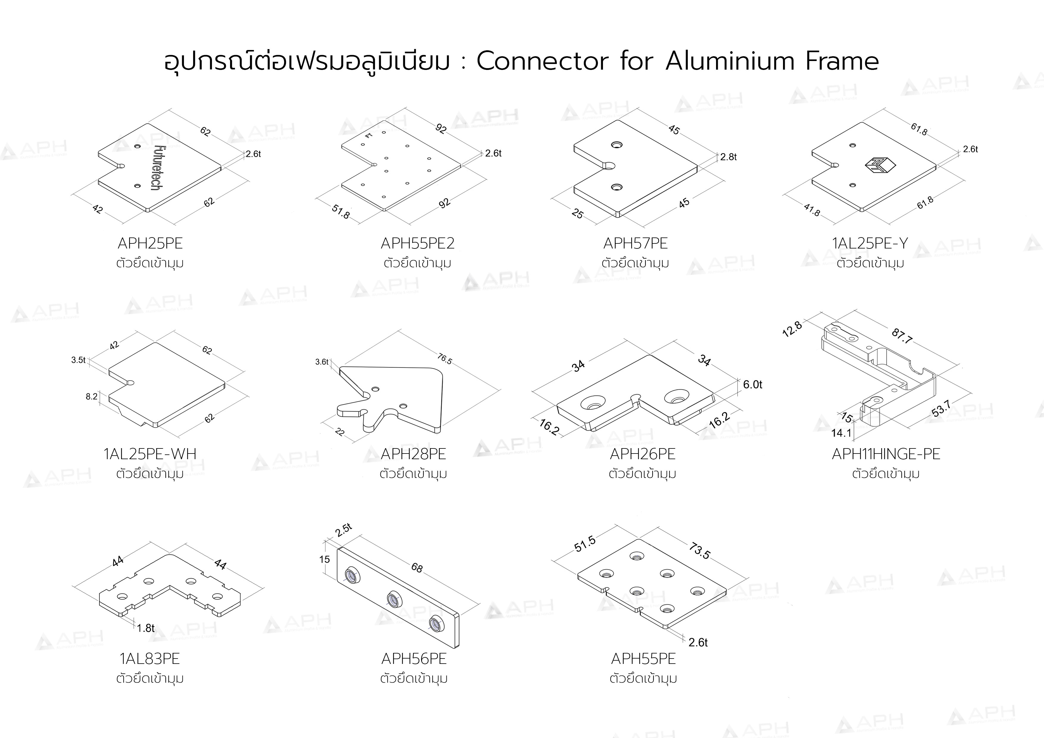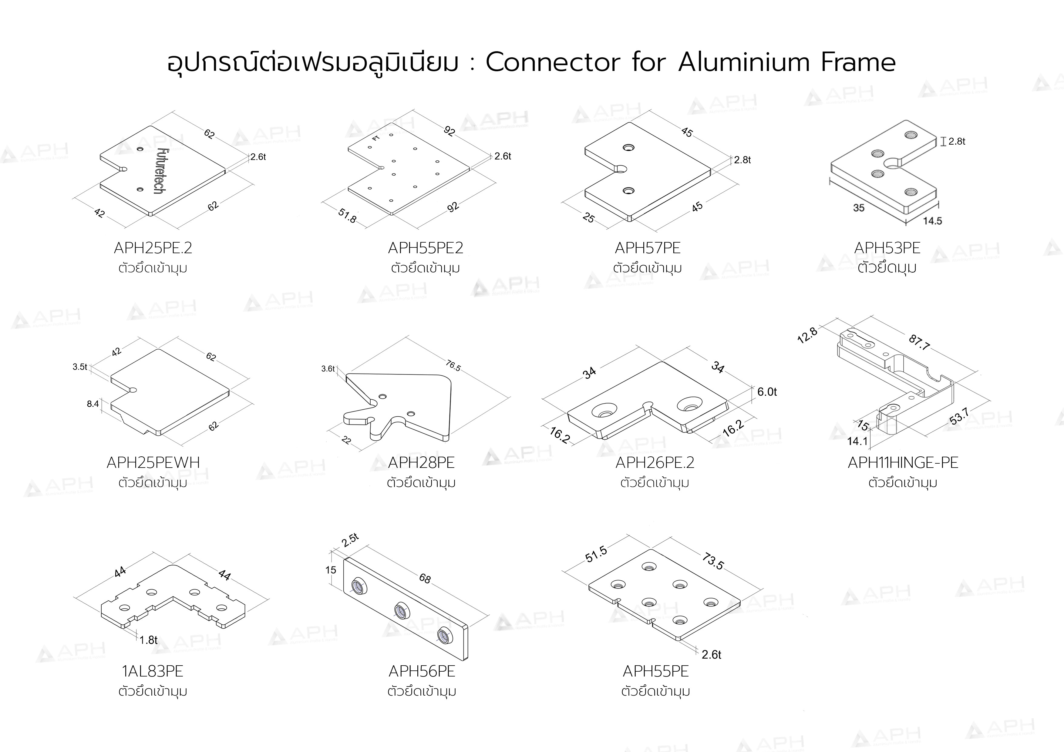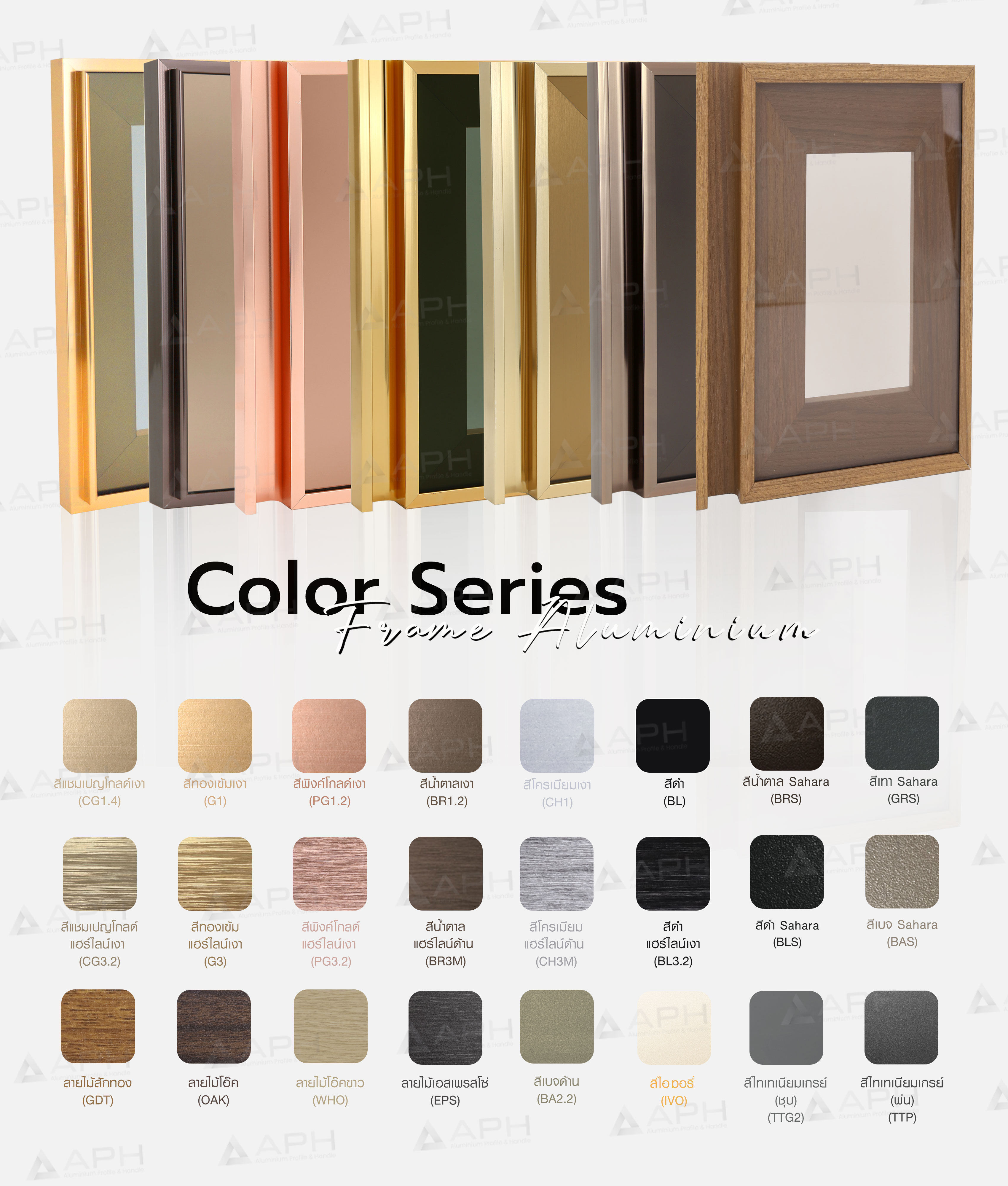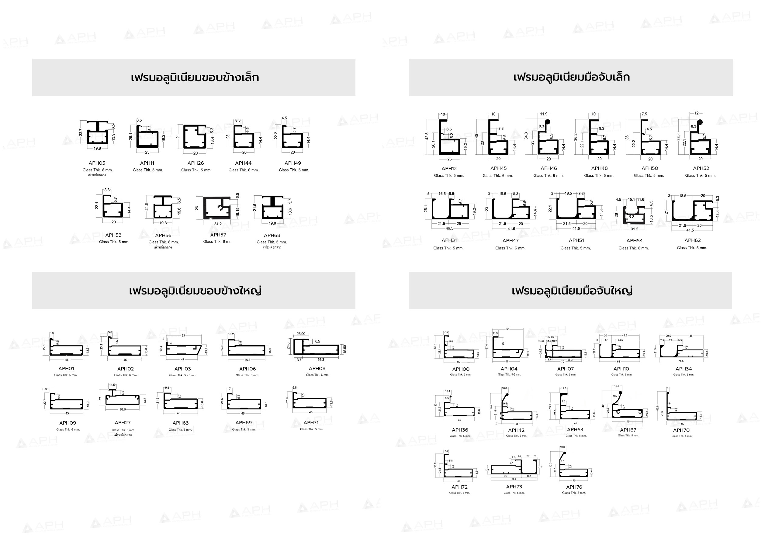 APH (เอพีเอช) ผลิตและออกแบบเฟรมอลูมิเนียม เฟรมอลูมิเนียมโปรไฟล์ ในรูปแบบเส้น รับผลิตแบบประกอบสำเร็จเป็นหน้าบาน และ มือจับอลูมิเนียมโปรไฟล์ ตามรูปแบบและขนาดที่ลูกค้าต้องการ โดยช่างผู้เชี่ยวชาญที่มีประสบการณ์สูง เราเลือกใช้วัสดุอลูมิเนียมเกรดดีที่สุด 6063 T5 ทำให้สินค้ามีคุณภาพดี แข็งแรง และทนทาน มีรูปแบบสีสันที่หลากหลาย เพื่อให้ลูกค้าได้เลือกสรรนำไปประกอบเป็นบานตู้ต่างๆ ทั้งตู้เสื้อผ้า, ตู้ครัว และอื่นๆ เฟรมอลูมิเนียม ของแท้ต้อง APH (เอพีเอช)